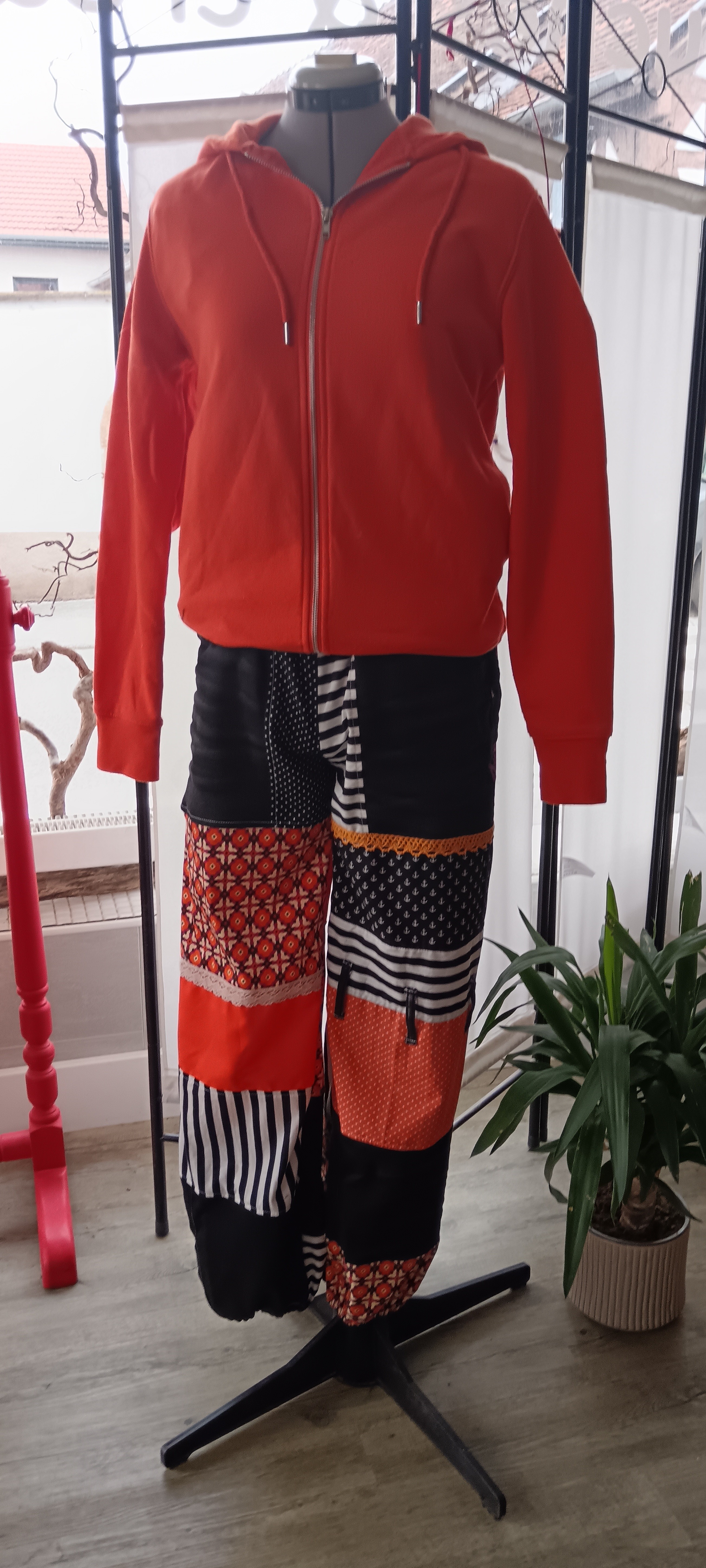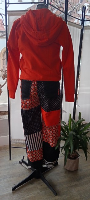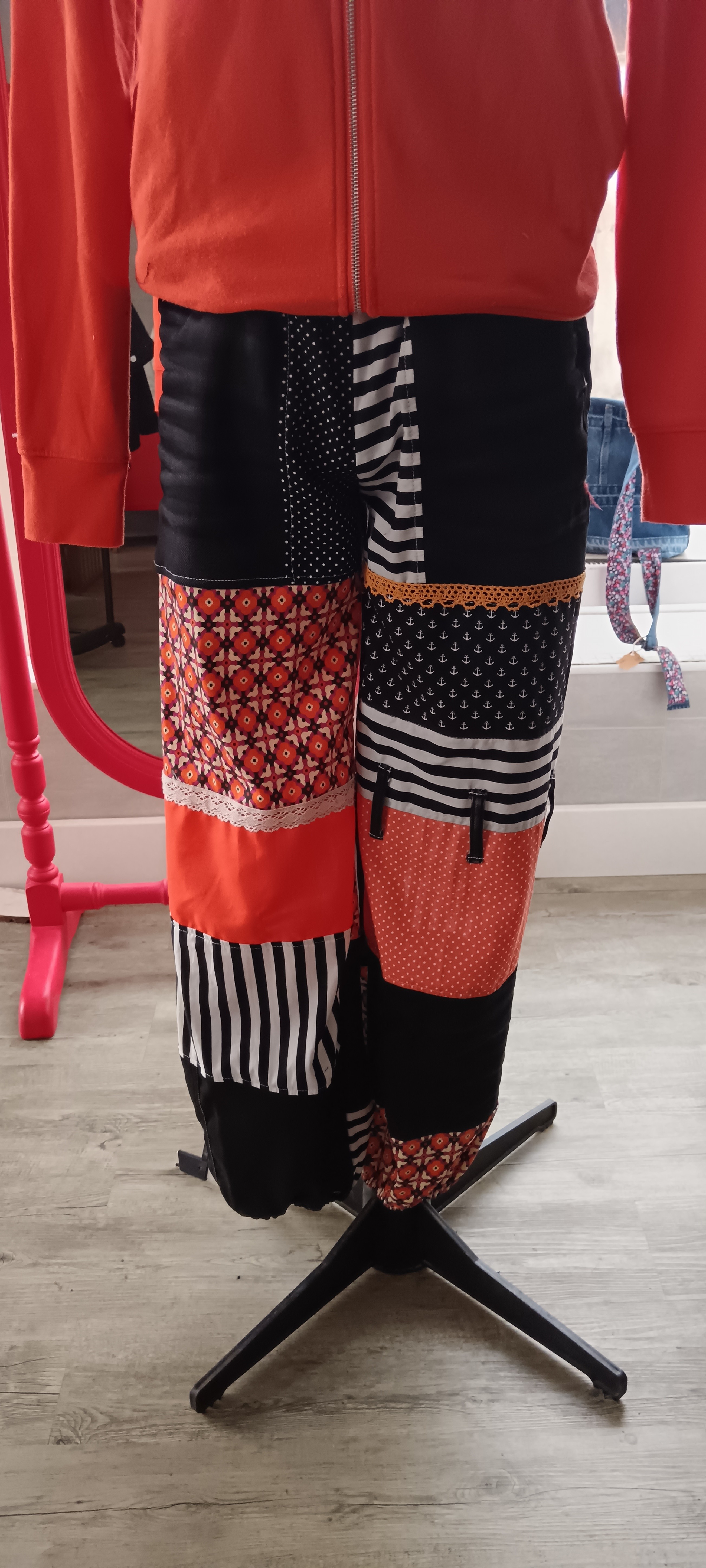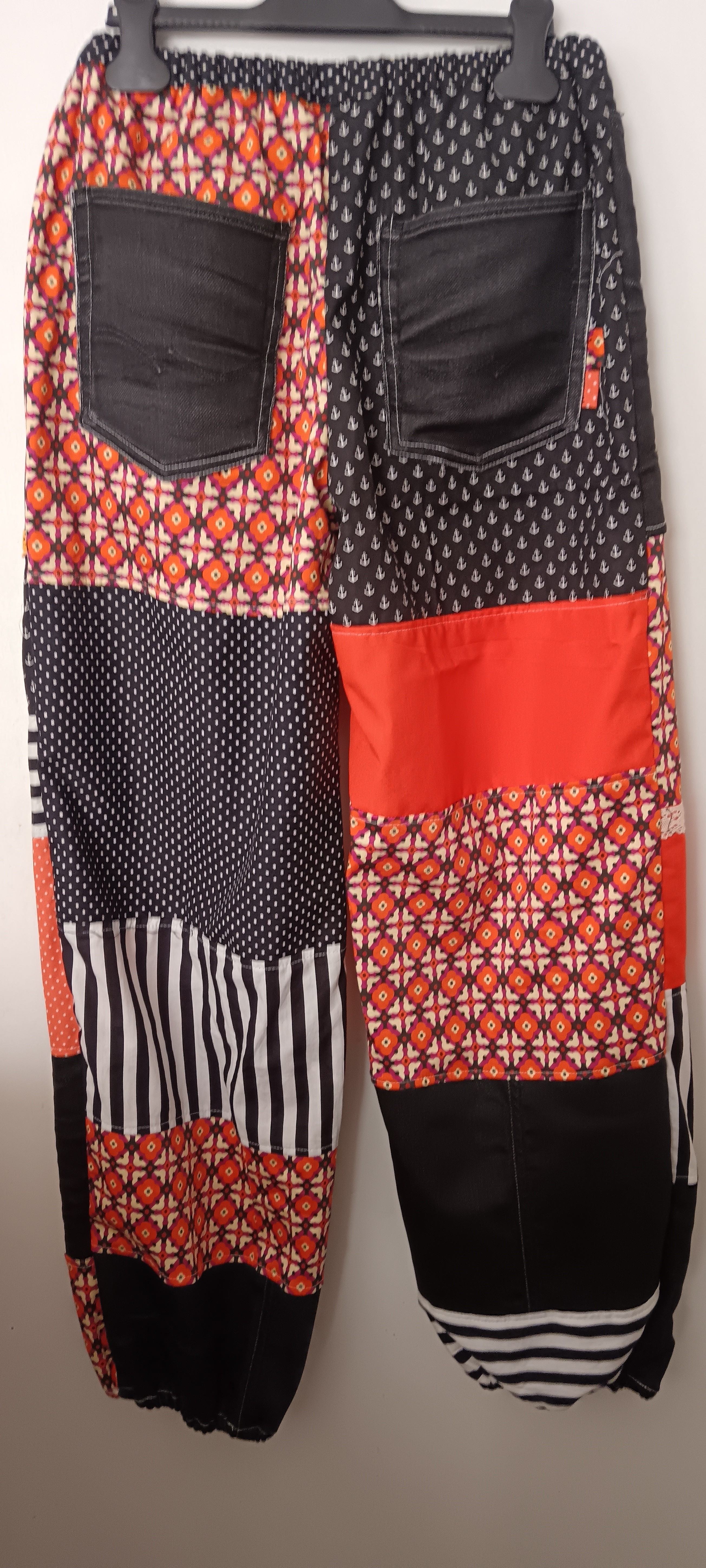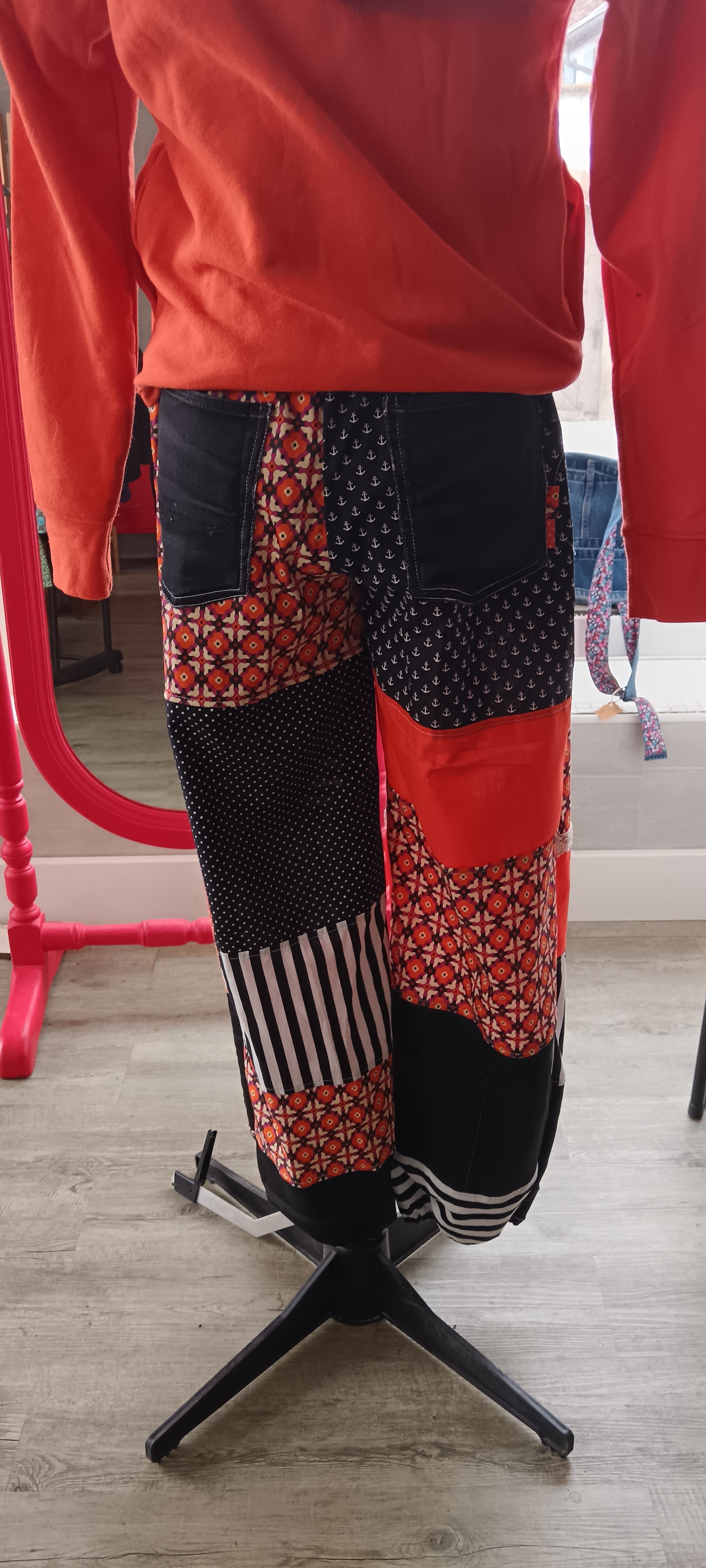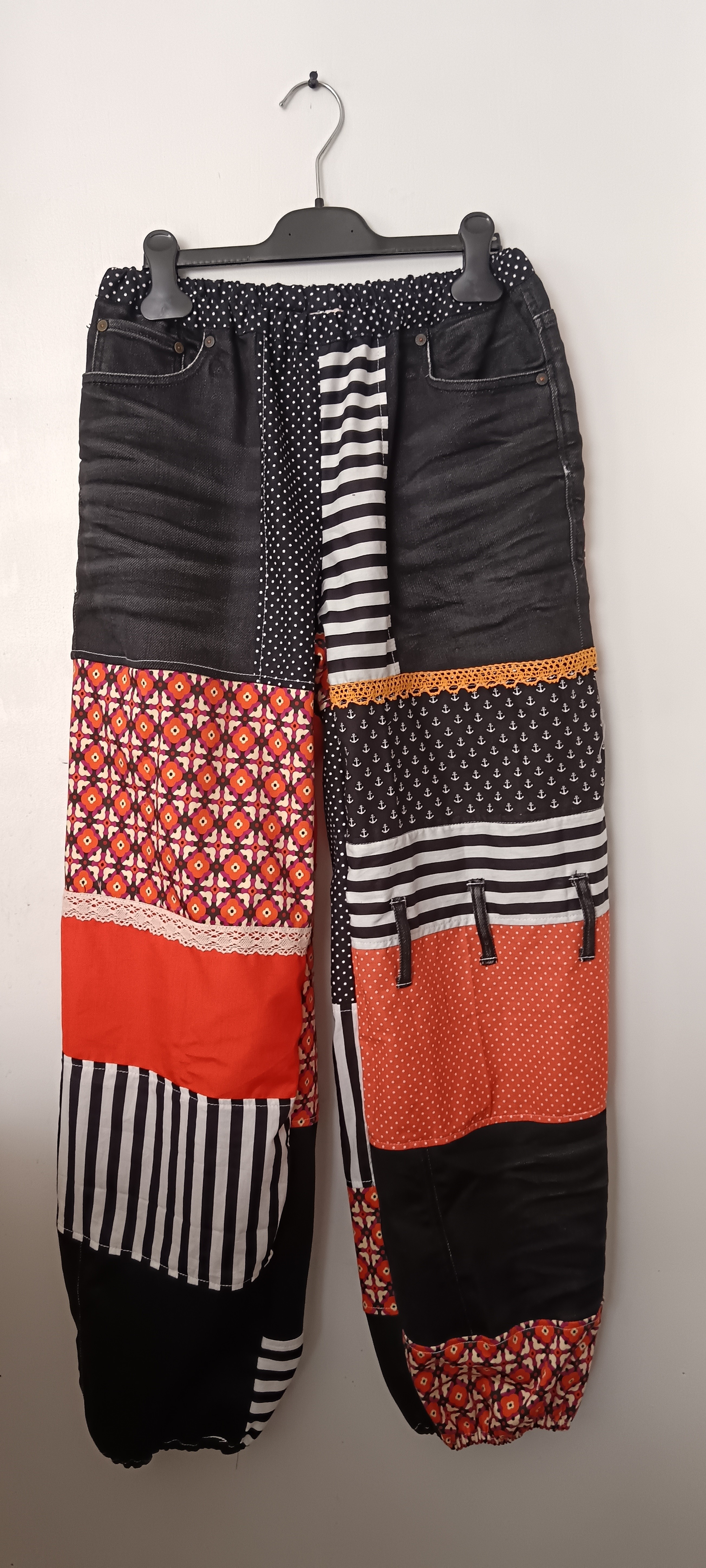 Pantalon création unique réalisé à partir d'un jean "usagé" associé à d'autres tissus, dans une démarche "éco-responsable".